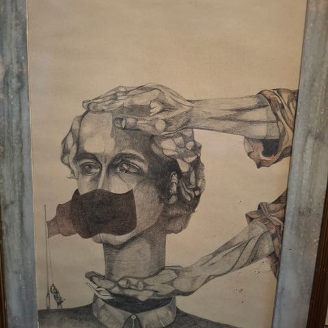 Fantastisk surrealistisk værk fra 1974.. ukendt kunstner.. signeret. 75×55.