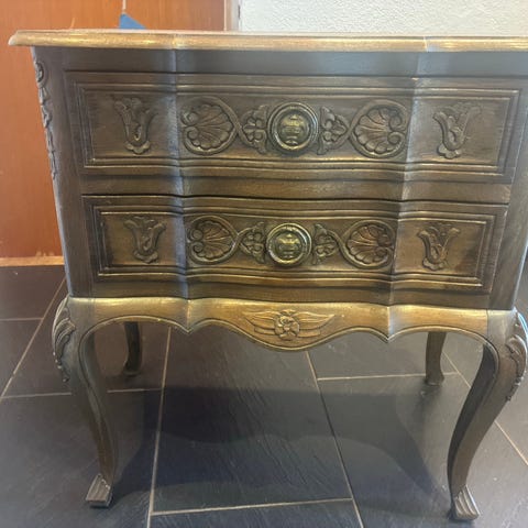 Kommoden er i træ i sortbejse. Bordet har drejede ben, en skuffe i kommodens bredde, en nedre hylde til opbevaring eller dekoration. Skuffen er med udskæringer og dekorativt messingfarvet beslag. Velegnet som entrémøbel eller i stue eller gang.
