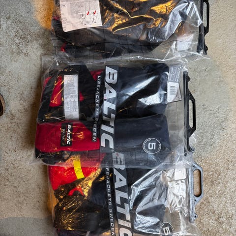 Baltic oppustelig redningsvest i rød (3 styk) og sort (1x) Vesten er udstyret med sele/remme til fastgørelse omkring krop og skuldre. Den anvender Baltic 33 g CO₂-patron ifølge mærkningen på den indvendige gule del. Velegnet som personlig flyde-/sikkerhedsudrustning til sejlads, hvor der ønskes en kompakt og oppustelig redningsvest. Flere eksemplarer i samme model og farvekombination fremgår af billederne.