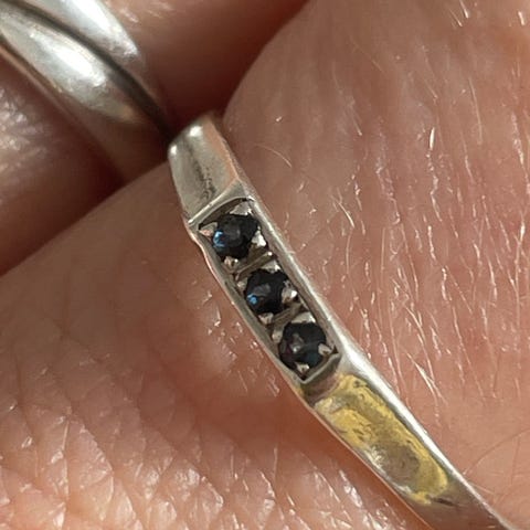 Sterling sølv ring med tre blå sten. Størrelse 55, stemplet i ringskinnen med 925 +et sølvsmedstempel. Nydelig stand. Pris kr 275