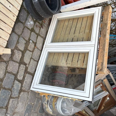 Rationel Aldus, træ/alu fast karm vinduesparti i 2 fag med sprosseopdeling fra 2011 (udgået model). Vinduet har farven Granit Noir 2100 Sable udvendigt og Hvid Ral 9010 indvendigt. Kan bruges som dobbeltvindue som i dag, eller deles i 2. Mål fremgår af tegningen.