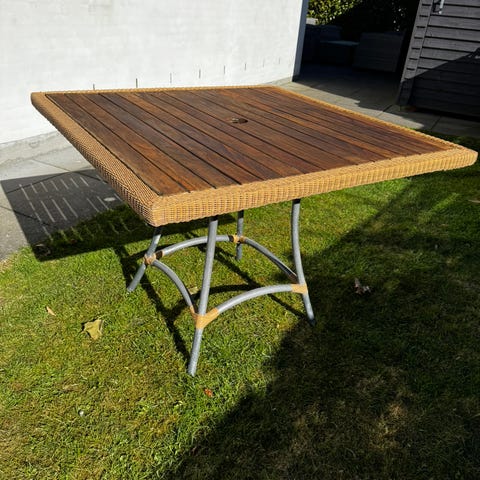 RESERVERET. Cane-line havemøbelsæt i flettet materiale bestående af et firkantet bord, to loungestole, en 2-personers sofa samt en skammel. Sættet er udført i lyst flet og leveres med løse hynder i lys, dæmpet farve til sofa, stole og skammel. Velegnet til terrasse eller have som samlet siddegruppe med bord til udendørs brug. Bordplade trænger til en gang slibning og lak.