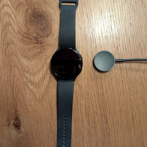 Samsung Galaxy Watch5 smartur i pink gold med rund touchskærm. Uret har en urkasse på ca. 40 mm og leveres med matchende silikonerem med justerbar lukning. Medfølgende magnetisk opladerkabel med USB-tilslutning. Velegnet som smartwatch til hverdagsbrug, aktivitetsmåling og notifikationer fra kompatibel smartphone.