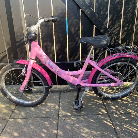 Pinepeak børnecykel med 18" hjul i pink. Cyklen har lav indstigning, kædeskærm, bagagebærer og kurv foran.