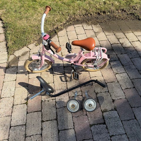 Puky børnecykel med 12" hjul i pink. Cyklen har lav indstigning, bagagebærer, støtteben, kurv foran, ringeklokke og håndbremse. Egnet til mindre børn, der skal lære at cykle på en lille cykel.