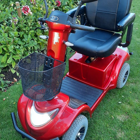 El-scooter 4-hjulet i rød farve med sort sæde. Modellen har styr med betjeningspanel, spejle og forkurv i plast. Bagpå er der monteret en ekstra metaltråds-kurv til opbevaring. Sædet er polstret med nakkestøtte og opklappelige armlæn. Scooteren har fodplade med skridsikker belægning og fire hjul for stabil kørsel. Velegnet som el-scooter til persontransport på fortove og jævne underlag.