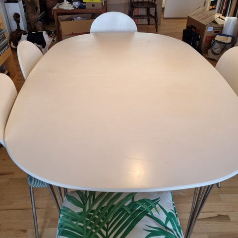 Spisebord, hvidt med udtræksplader ilagt under bordpladen til 12 pers