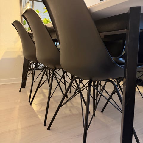 Spisebord, hvid melamin med små synlige brugsspor og 12 sorte spisebordsstole med synlige ridser, se fotos