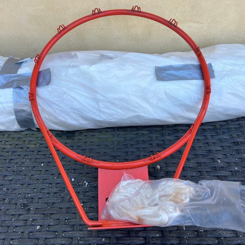 Basketball kurv, højde kan justeres, sandfyldt base, bagplade skal skiftes. Quickfix - plexiglas eller anden plade skal blot monteres. Nypris kr 3000