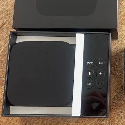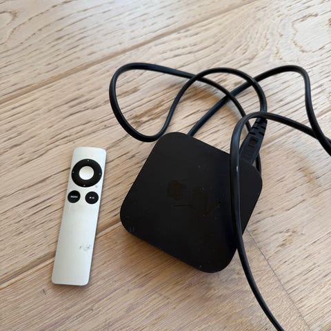 Apple TV med fjernbetjening i sort. Medieafspiller til tilslutning til tv via HDMI for streaming af film, serier, musik og apps. Fjernbetjeningen har touch-overflade samt knapper til menu, afspil/pause, lydstyrke og navigation. Enheden tilsluttes strøm og netværk via kabel eller trådløst, afhængigt af model og opsætning.