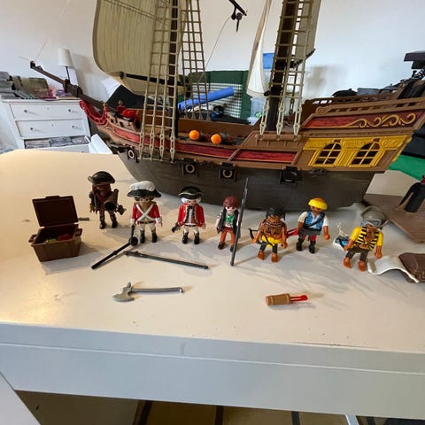 Playmobil piratskib og borg dele. Sættet består af forskellige Playmobil plastdele i hovedsageligt brune og beige nuancer, herunder skibsskrog, borgmure, vogne, tilbehør og løse smådele. Der medfølger også trykte samlevejledninger. Egnet som reservedele eller til at samle komplette Playmobil pirat- og borgmiljøer, afhængigt af hvilke dele der er til stede i lotten.