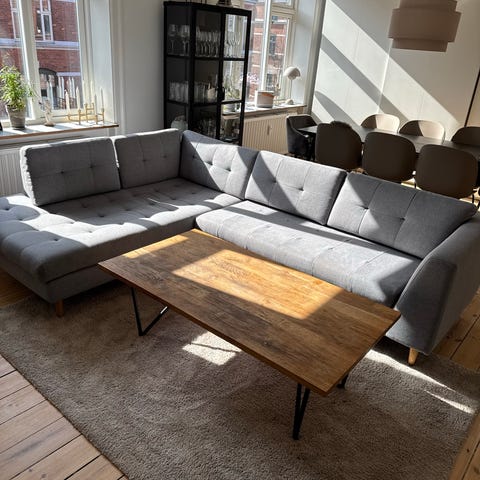 Flot og dejlig blød sofa, som giver plads til hverdagslivet i fin farve. Fodskamlen gør indretningen med sofaen fleksibel og kan give plads til flere mennesker. Og sofaen er stor nok til at man ligge på langs.