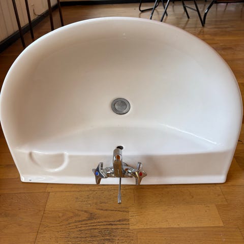 Ifö håndvask i hvid keramik. Rektangulær model med afrundet bassin og hul til armatur i den ene side. Der medfølger vægbeslag og et armatur, som ses på billederne. Velegnet til montering på badeværelse eller gæstetoilet, hvor der ønskes en kompakt væghængt løsning.