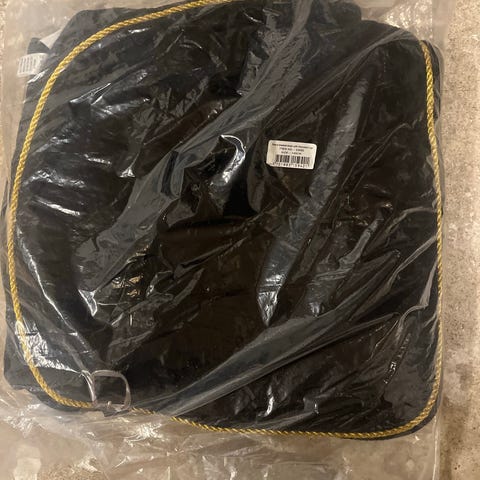 Ridetæppe i lyserød nuance med kontrastkant. Tæppet har diamantquiltet mønster og stropper til fastgørelse ved sadlen. Egnet til brug under sadel for at give hesten ekstra komfort og beskyttelse af ryggen. Der er en synlig plet på den. Str 17