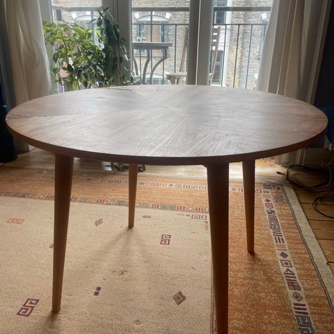 IKEA sofabord i rundt design med bordplade i lyst trælook. Bordet har en krydsformet sokkel/base i matchende trælook, som giver stabilitet og luftigt udtryk. Velegnet som sofabord eller sidebord i stue eller opholdsrum. Designet til indendørs brug.