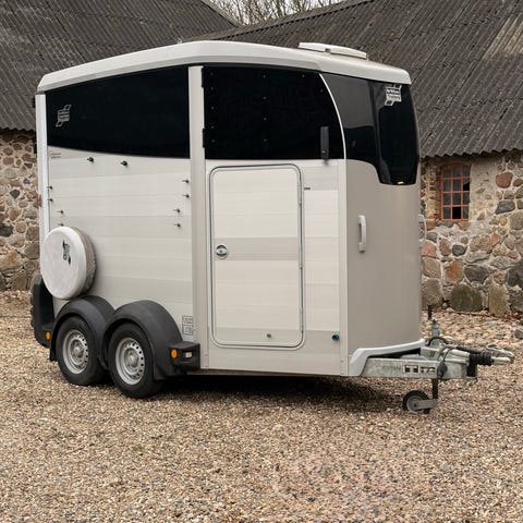 Glasfiber sider og tag med Ali bund Hestetrailer to-akslet i sort. Traileren har bagrampe med skridsikker overflade og indvendig opdeling til transport af to heste. Indvendigt er der sadelrum med sadelholdere, hylder og kroge til udstyr. Trailerens sider og loft er lyse indvendigt med ventilationsåbninger.
