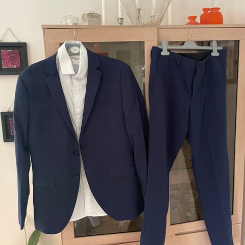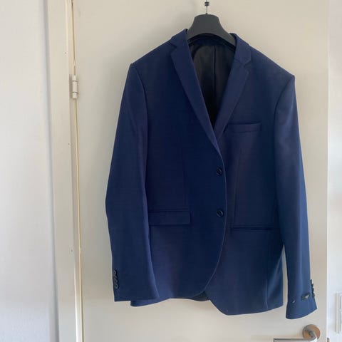 Jack & Jones jakkesæt til herre i str. 50. Sættet består af jakke og bukser i grå polyester. Klassisk jakke med revers, to knapper foran, brystlomme samt forlommer. Matchende bukser med lige ben og bæltestropper. Velegnet som formelt sæt til arbejde eller festlige lejligheder.