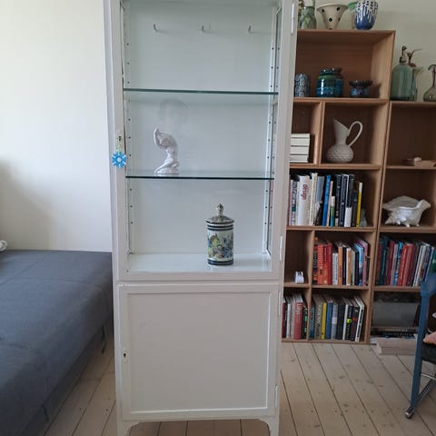 Tandlægeskab fra 50erne med den patina et sådan skal have. Alle greb er originale og både glashylder og den hvide plade øverst er intakte. Vi har brugt det til entremøbel og til opbevaring af alt det man ellers ikke ved hvor man skal gøre af. Kan også være et rigtig fint barvogn/møbel.