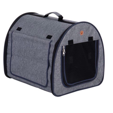 Den er str. Large med mål: 53x45x41 cm, til hunde der vejer op til ca.12 kg