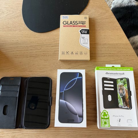 Jeg sælger min iPhone 16 Pro i farven Natural Titanium. Telefonen er under et år gammel og har altid haft panserglas, så skærmen er perfekt. Der er minimale brugsspor på siderne, men intet af betydning (se billeder)