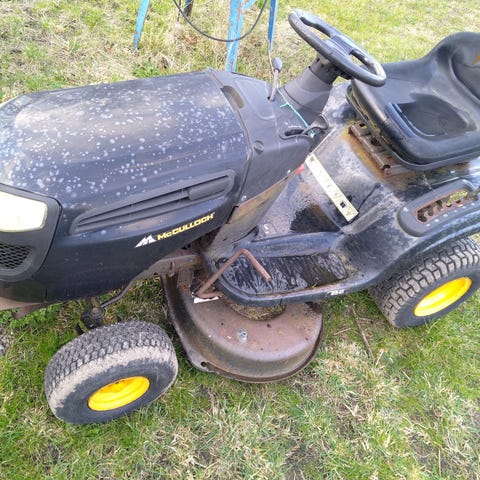 Plænetraktor i sort og gul. Maskinerne fremstår uden klipperdæk påmonteret og med synlige brugsspor. Der ses mekanisk gearvælger ved siden af sædet. Egnet som reservedele eller projektmaskiner til reparation eller ombygning. Yderligere specifikationer som motorstørrelse, klippebredde og mærke er ikke oplyst og kan ikke aflæses tydeligt på billederne.