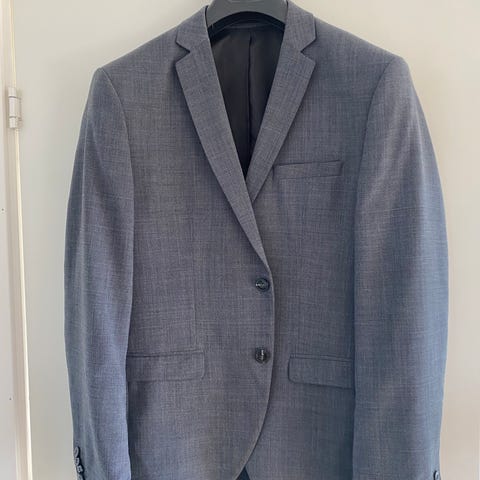 Jack & Jones jakkesæt til herre i blå polyester, størrelse 50. Sættet består af blazer og bukser i ensfarvet design. Blazeren har revers, lommer foran og lukkes med knapper. Bukserne har klassisk pasform med lommer og lukning foran. Egnet til brug ved formelle lejligheder, arbejde eller andre anledninger, hvor der ønskes et enkelt og neutralt jakkesæt. Sættet er brugt maks 5 gange.
