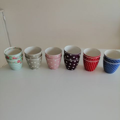 Der er 12 små skåle, 3 à hver i lyserød, lysegul, lysegrøn og lyseblå. Der er 4 lidt større skåle i tilsvarende farver.