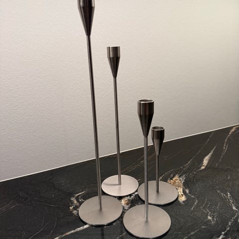 Klassisk lysestage af mærket Piet Hein. 21 cm. høj. Velegnet til almindelige kronelys. Neutral, børstet metaloverflade. Fin stand, en anelse sod fra nedbrændte lys, men det ses stort set ikke, når der er lys i. Kan sendes eller afhentes på Amager.