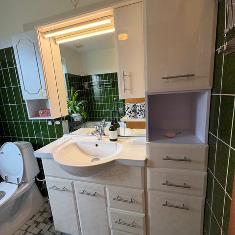 Medfølger: Vask + underskab + armatur + spejl + skab