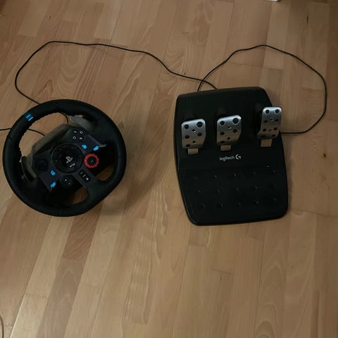 Logitech G29 rat og pedaler til gaming. Sættet består af et rat med knapper og drejeknap samt pedalmodul med gas-, bremse- og koblingspedal. Egnet til racingspil og køresimulatorer, typisk til brug med konsol eller pc, afhængigt af kompatibilitet.
