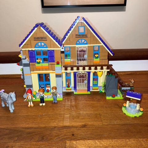 LEGO Friends byggesæt med hus og tilbehør. Sættet indeholder et hus i flere etager med tag, vinduer, dør, skorsten og udendørs område med blomster og små detaljer. Indvendigt ses blandt andet senge, køkkenområde og opholdsplads. Der medfølger flere minidukker samt en lille kattefigur og ekstra småbyg som fx køretøj og mindre stand. Velegnet til leg med rollelege og opbygning af forskellige hverdagssituationer i Friends-universet.