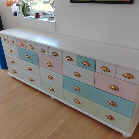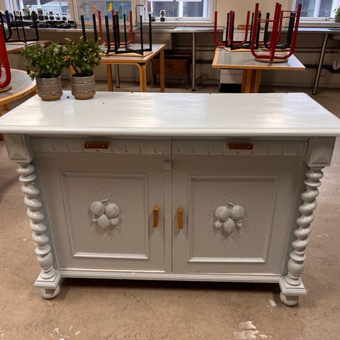 Charmerende skænk i en smuk turkis farve med fine detaljer og buede ben.