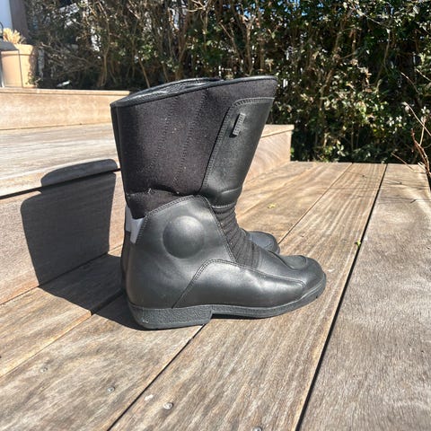 Motorcykelstøvler str 45 i sort farve. Støvlerne har forstærkninger ved ankel og skinneben samt skridsikker sål. Overdelen er en kombination af glat materiale og tekstil med flekszoner over vristen for bedre bevægelighed. Velegnet som beskyttende fodtøj til motorcykelkørsel. Brugt, men i meget fin stand.