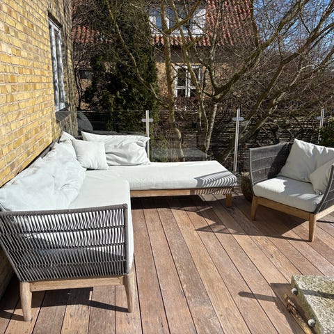 Hjørnesofa loungesæt til haven med bord, sort flet med lilla hynder