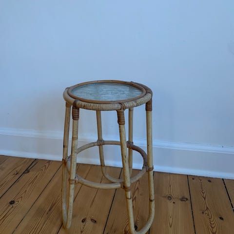 Interstil taburet i kobberfarvet metal. Taburetten har trekantet sæde med bløde kurver og tre buede ben. Undersiden er mærket med Interstil-logo. Velegnet som ekstra siddeplads eller som lille sidebord i stue, entre eller soveværelse.