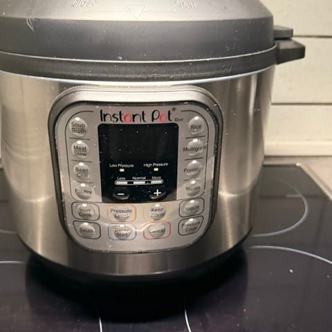 Så god som ny, brugt primært til kogning af bønner. Den har ledning og brugshåndbog med - alt intakt: Det eneste som viser tegn på brug er højre side som har fået en lille bule under flytning. Den sælges kun pga. plads mangel - man kan lave alt slags mad i den, bone broth, forskellige retter og langtids simreretter.