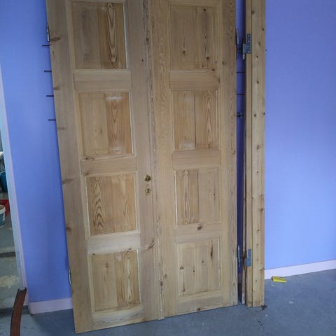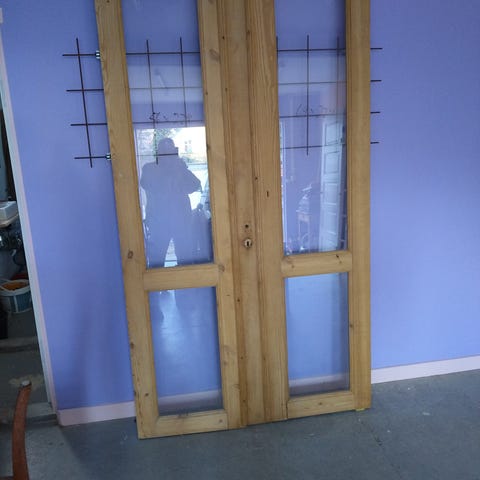 Fyrretræs dobbeltdøre med glasfelter. Dørene består af to dørfløje i fyrretræ med 12 mindre glasruder i hver fløj. Medfølgende karm, Br. 12 cm, ses på billederne. Velegnet som indvendig dør mellem rum, hvor der ønskes lysgennemgang.