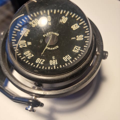 Ældre engelsk Sestrel skibskompas i grå metalhus. Kompasset er monteret i gyroskopisk ophæng med sidearme og messingfarvede justeringsskruer. Skiven har tydelig gradinddeling og kardinalmærker. Velegnet som navigationsudstyr på båd eller som maritimt instrument til indendørs brug eller samling.