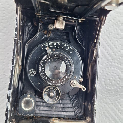 Kameraet fremstår i pæn stand med original træramme, messingdetaljer og intakt bælg. Perfekt som samlerobjekt eller dekorativt element.