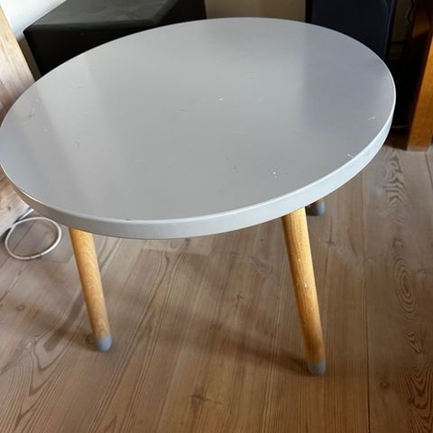Flexa børnebord og taburet i sæt. Rundt bord med hvid bordplade og ben i lyst træ med hvide fødder. Tilhørende lille taburet med samme ben i træ; med hvid siddeflade og rødt betræk med hvide prikker. Egnet som børnebordssæt til leg, tegning og andre aktiviteter på børneværelset eller i legehjørnet.