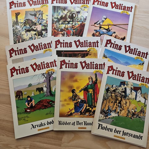 Prins Valiant tegneserier i albumformat. Flere forskellige bind med danske titler, blandt andet eventyr og historier fra middelalderuniverset omkring figuren Prins Valiant. Trykt i farver og velegnet til læsning for både samlere og læsere af klassiske tegneserier. Antal og specifikke titler fremgår af billederne.