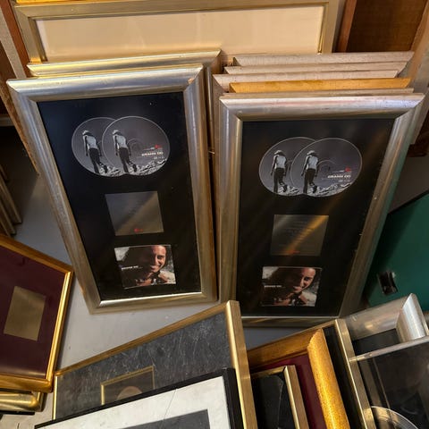 Indrammede guld- og platinplader egnet til ophæng på væg. Pladerne er monteret i rektangulære rammer med glasfront og baggrund i mørk farve. Hver ramme indeholder en cd eller lp-plade samt tilhørende covermotiv og plaketter. Velegnet som dekoration i musikrum, stue, studie eller lignende miljøer, hvor der ønskes musikrelateret vægpynt. Flere rammer ses på billedet, hvilket kan indikere mulighed for køb af flere enheder samlet eller enkeltvis, afhængigt af sælgers angivelse.