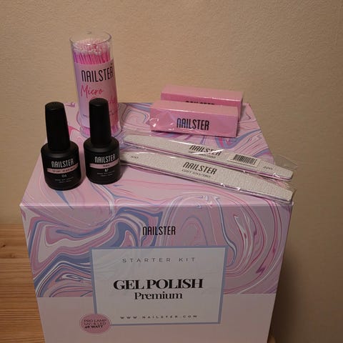 Nailster Gel Polish Premium starterkit til negle. Sættet indeholder forskellige produkter til gelnegle, herunder base coat, farvet gel polish og glitter gel polish samt tilbehør til påføring og aftagning.