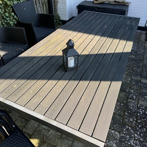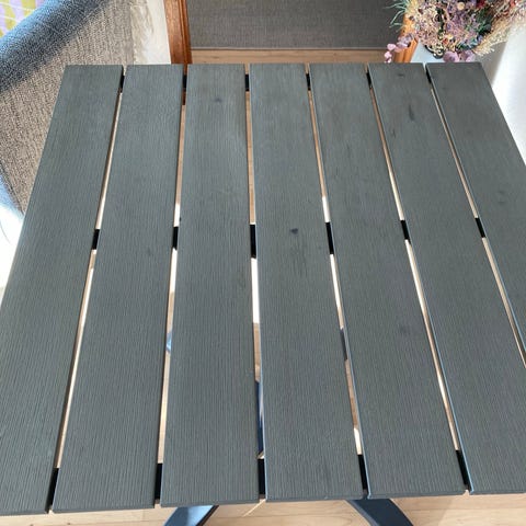 Kvadratisk havebord med lamelbordplade i trælook grå og sort stel.Velegnet som café- eller altanbord samt til mindre uderum, hvor der er behov for et kompakt bord med robust fod.