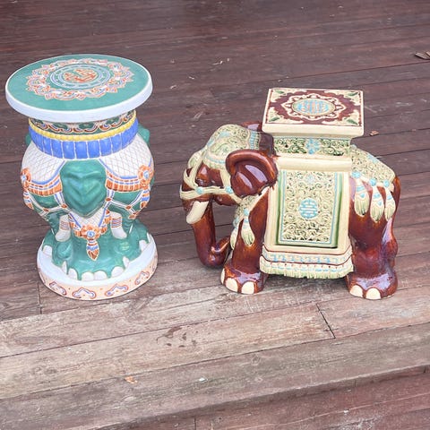 - Sættet består af én større piedestal udformet som en elefant med flad topplade samt tre mindre elefantfigurer med dekorative mønstre. Den store piedestal har en højde på ca. 40 cm, og de mindre figurer er lavere. Overfladen er glaseret i grønne, cremefarvede, blå og gyldne nuancer med ornamenterede detaljer. Piedestalen kan anvendes som plante- eller vaseholder, mens de mindre figurer kan bruges som dekoration i hjemmet eller som små sokler til lette genstande.