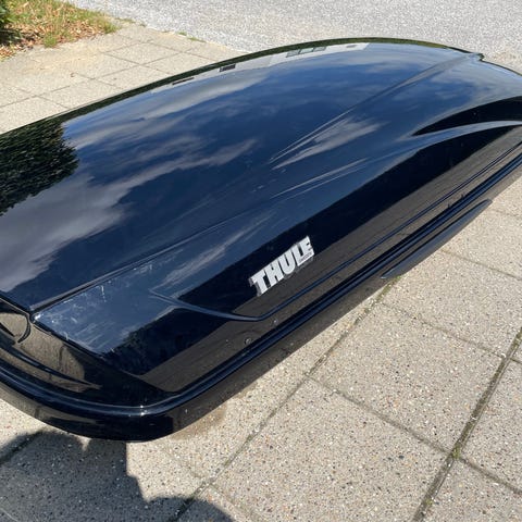 Thule tagboks i sort. Aerodynamisk model med glat låg og forstærket bund. Easygrip, kan fastgøres til tagstænger uden brug af værktøj. Vi har været glade for boksen, hvor der har været alt fra barnevogn og klapvogn til en grill tur/retur til Italien. Sælges de børnene er store og der ikke er behov for så meget plads. Farven er mørk/sort med blank overflade.