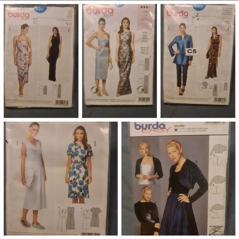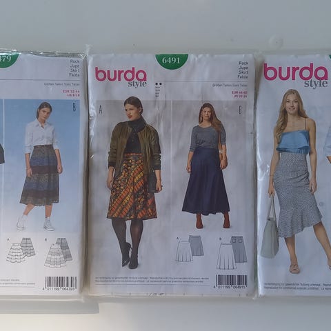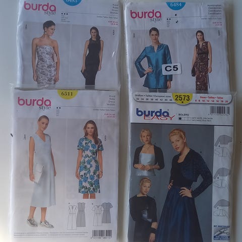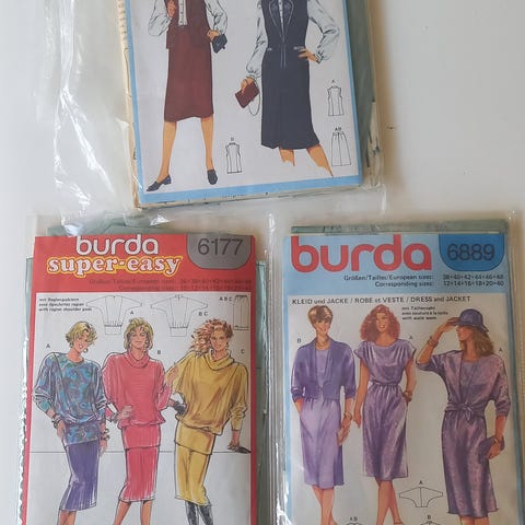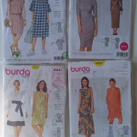 Burda snitmønster til dametøj. Pakkerne indeholder mønstre til forskellige modeller af kjoler, toppe og bukser til kvinder. Egnede til syning af tøj i vævet stof eller jersey afhængigt af det enkelte mønsters anvisninger. Størrelser og detaljer fremgår af de enkelte mønsterark i pakkerne.