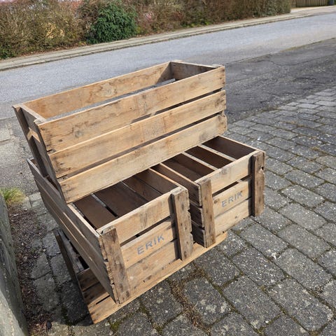Har de her tre æblekasser. Trænger nok til et par søm hist og her, men ellers fine. 50 kr. pr. stk. eller alle tre for 100 kr. hvis nogen er interesseret.