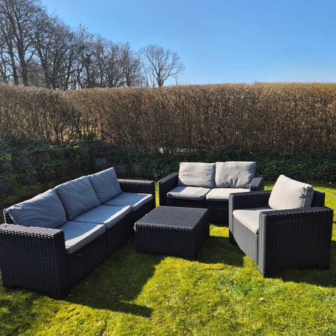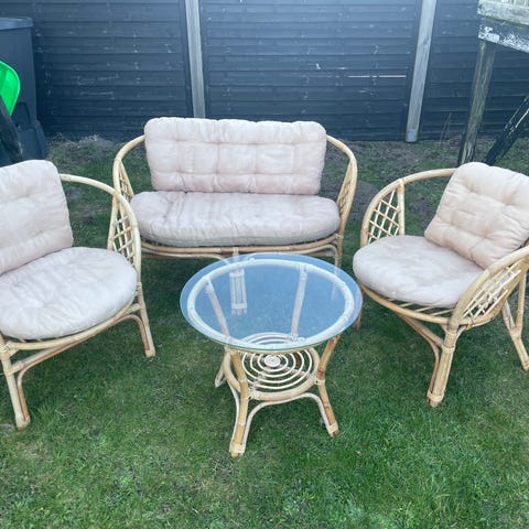 Pænt loungesæt med hynder og puder. Glasplade følger med, så den ene del kan bruges som bord. Se billedet.