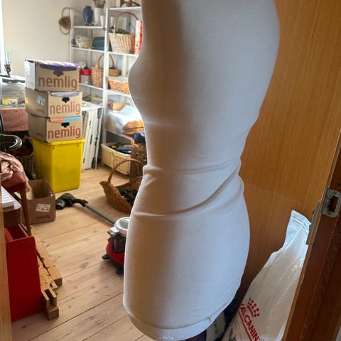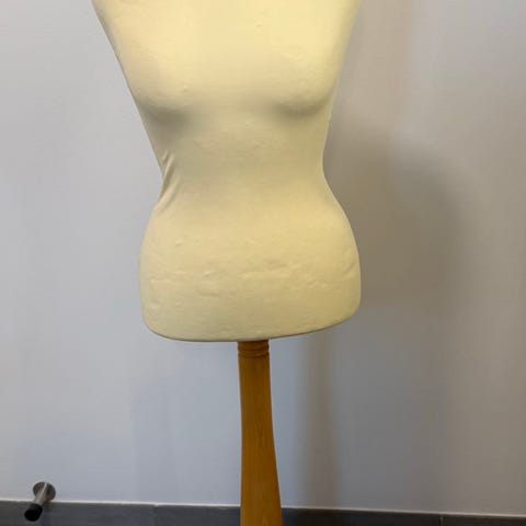 Dame giner i fuld figur med beige overflade og træfod med tre ben. Kroppen er formet efter en kvindelig torso uden arme og hoved, velegnet til fremvisning eller tilpasning af tøj. Ginen står på en stabil fod i lyst træ, som giver god balance. Egnet til brug i butik, showroom eller til syning og designarbejde derhjemme.